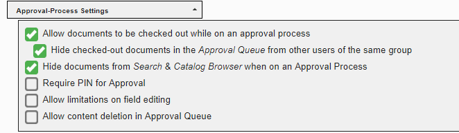 While UNCHECKED, the document will be visible and searchable for users and groups with VIEW and SEARCH permissions, regardless of the Approval Process.
