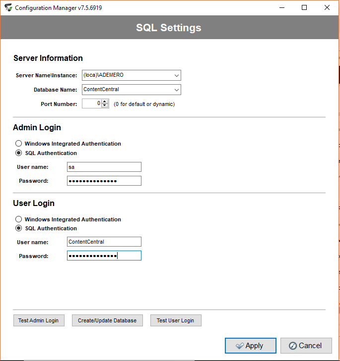 IF SQL Authentication is selected, enter Username and Password to use. The SQL User Account must have Read and Write Rights to the Content Central Database in the Server Information.