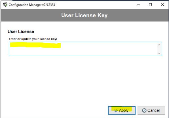4. Once the "Enter License Key" option is selected, insert your new license key into the blank box that appears and click "apply". If you have a pre-existing key, you may discard the existing key that exists in the box by backspacing the key and pasting your new key into the new empty box, then click "apply".