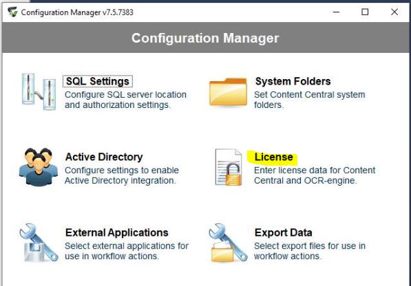 1. When you receive your license key log onto the server that is hosting the Content Central application. If no changes have been made to the desktop icons since the initial installation, there should be three icons present with the following names: Catalog Manager, Configuration Manager and Content Central Login. The item we are looking to make an adustment to is going to be in the Configuration Manager. Double click the configuration manager Icon in order to view its contents and options.