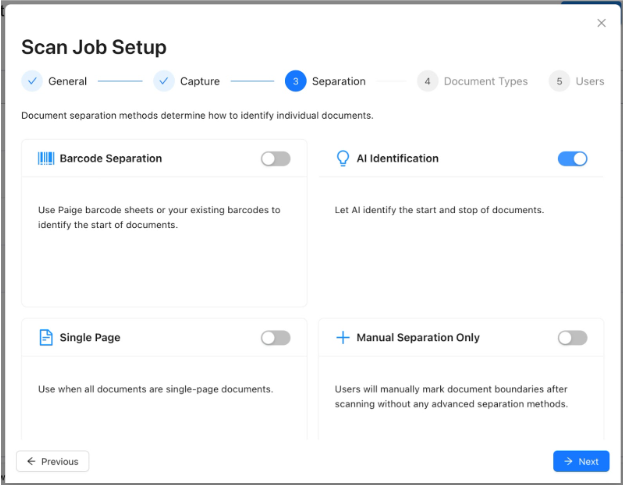 - AI Identification: Leverage Paige’s built-in AI guidance to intelligently identify document start and stop points. You can customize AI guidance in the Scan Job Settings for enhanced accuracy.