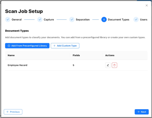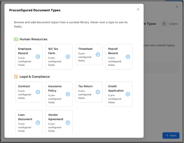 Select Add from the Preconfigured Library to browse and select Document Types from the curated library of standard templates.