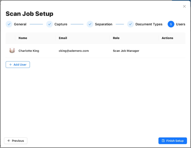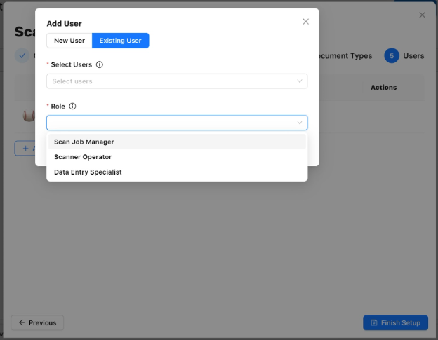 Select Add Users. New users or existing users can be added to the Scan Job as a Scan Job Manager, Scanner Operator or Data Entry Specialist.