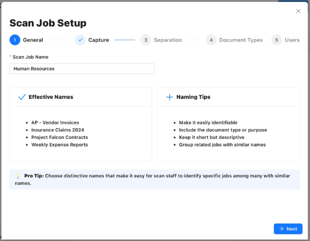 In the Scan Job Setup menu, enter Scan Job Name. Select Next to proceed.